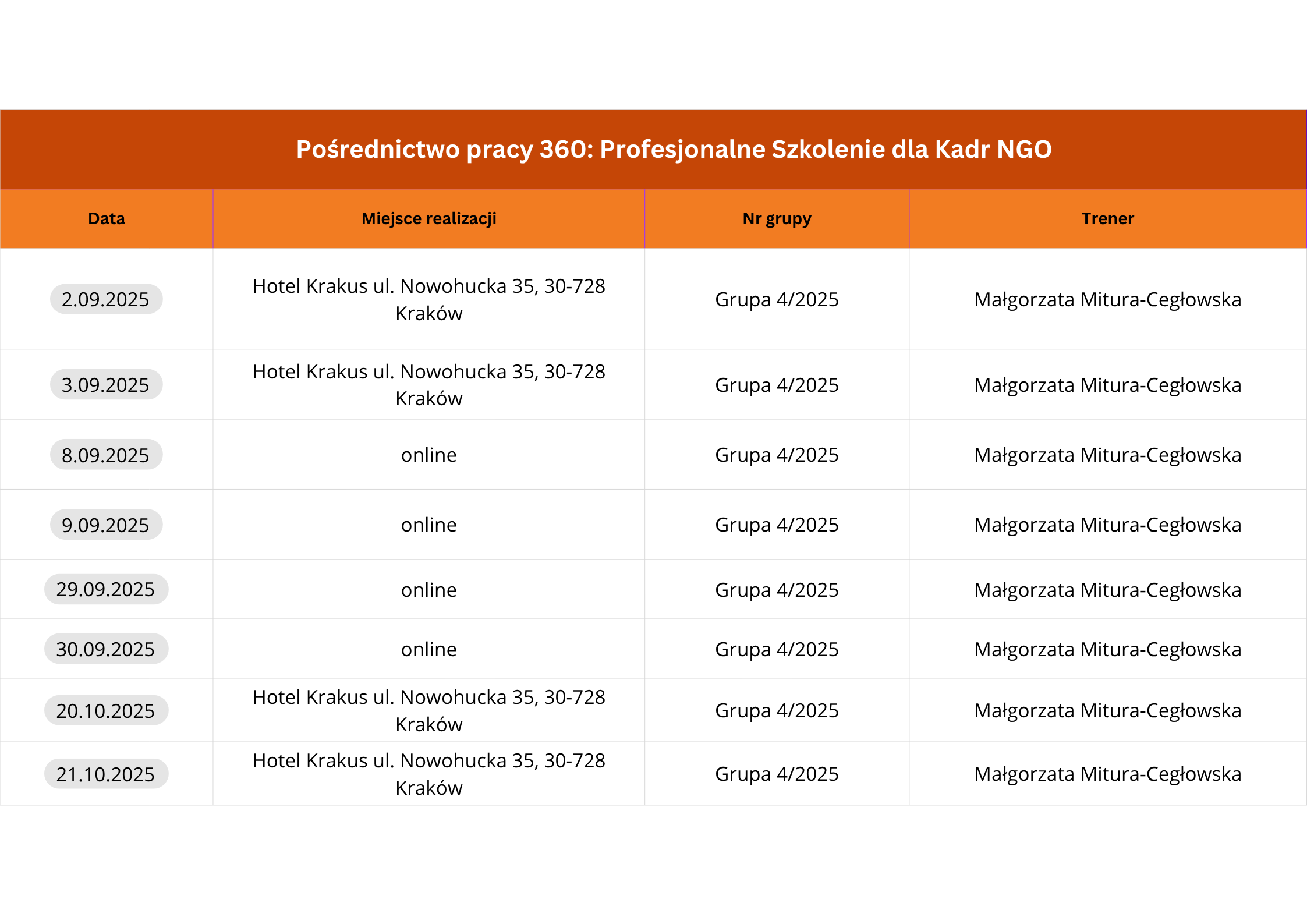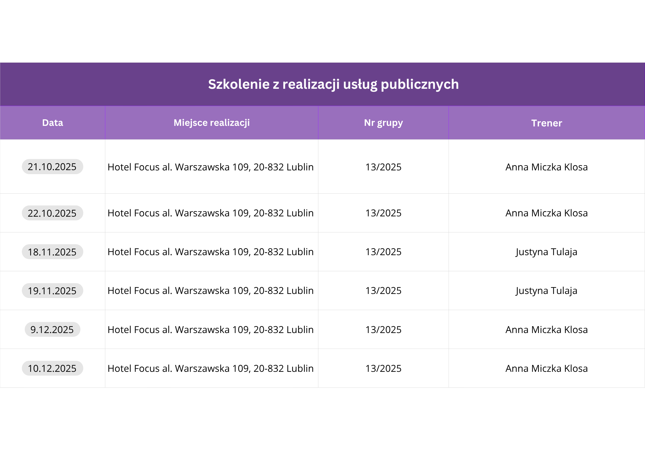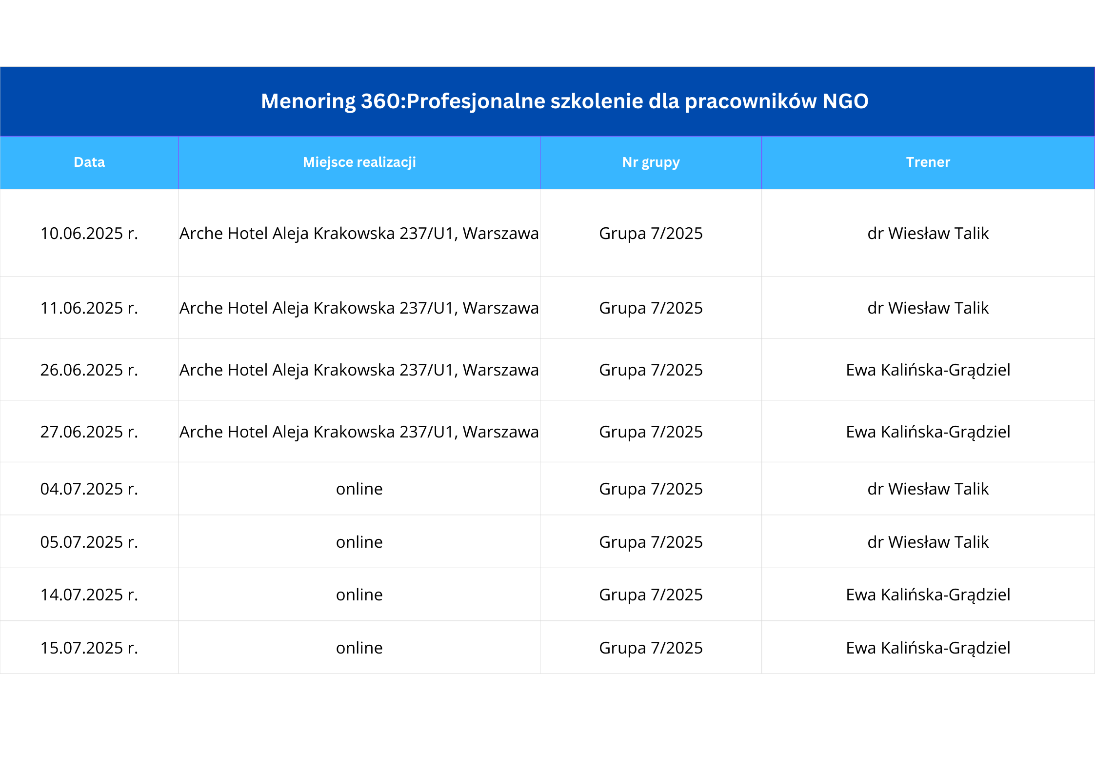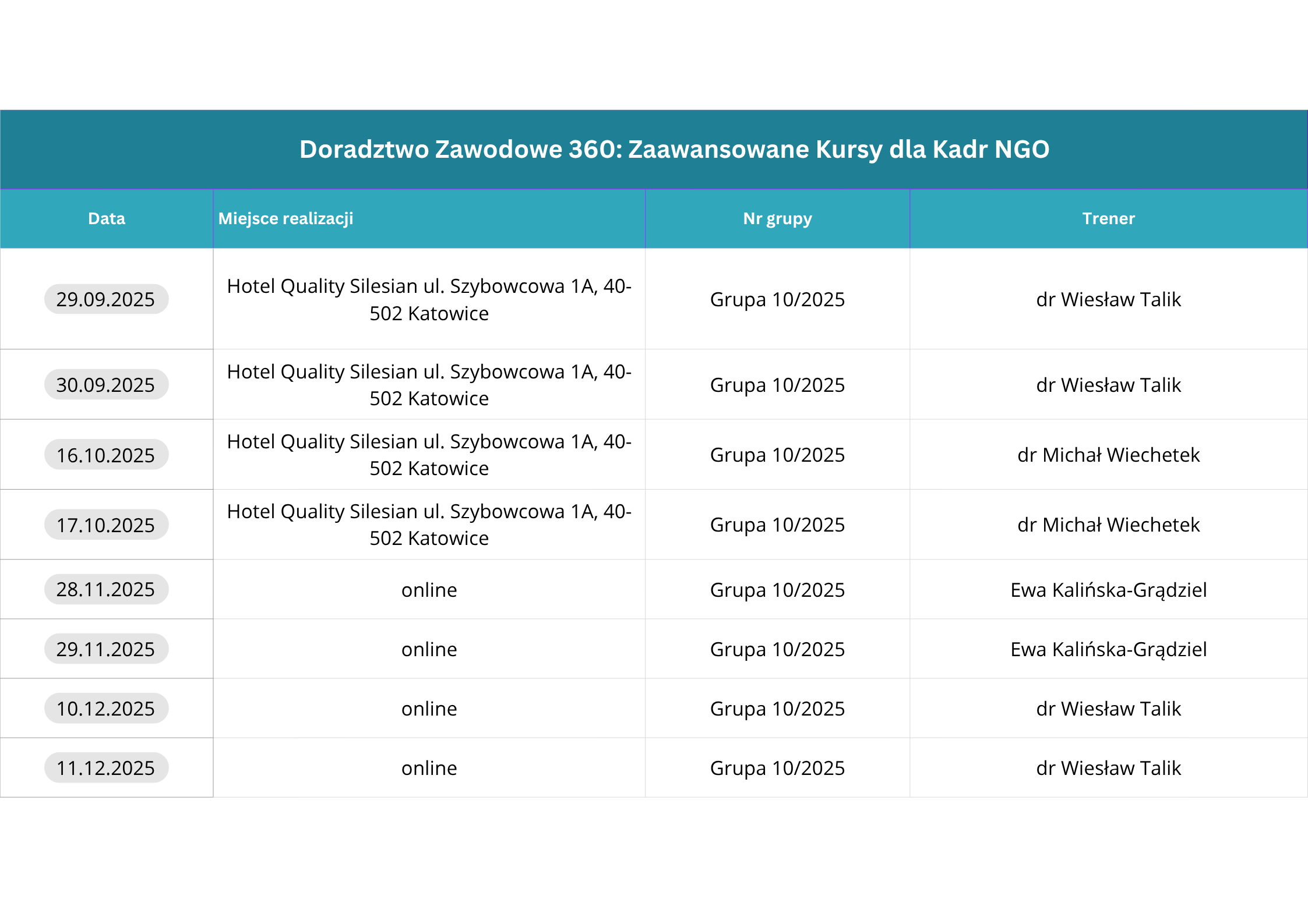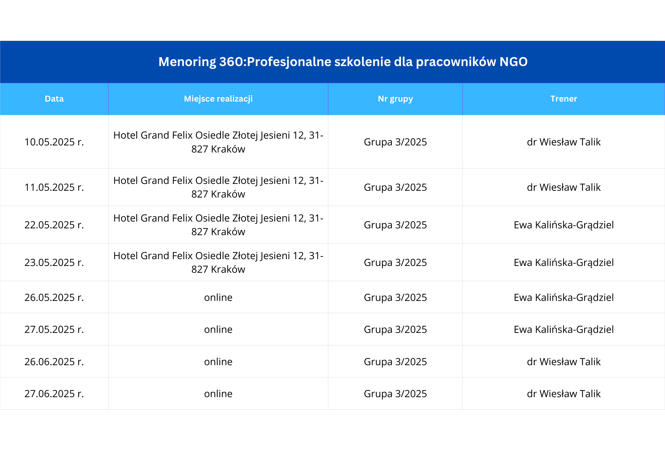 Planuje się organizację szkoleń w dużych miastach, umożliwiający swobodny dojazd. Wszystkie szkolenia obejmują 64 godziny i zostaną zorganizowane hybrydowo – 2 zjazdy w formule stacjonarnej, 2 zjazdy w formule online.