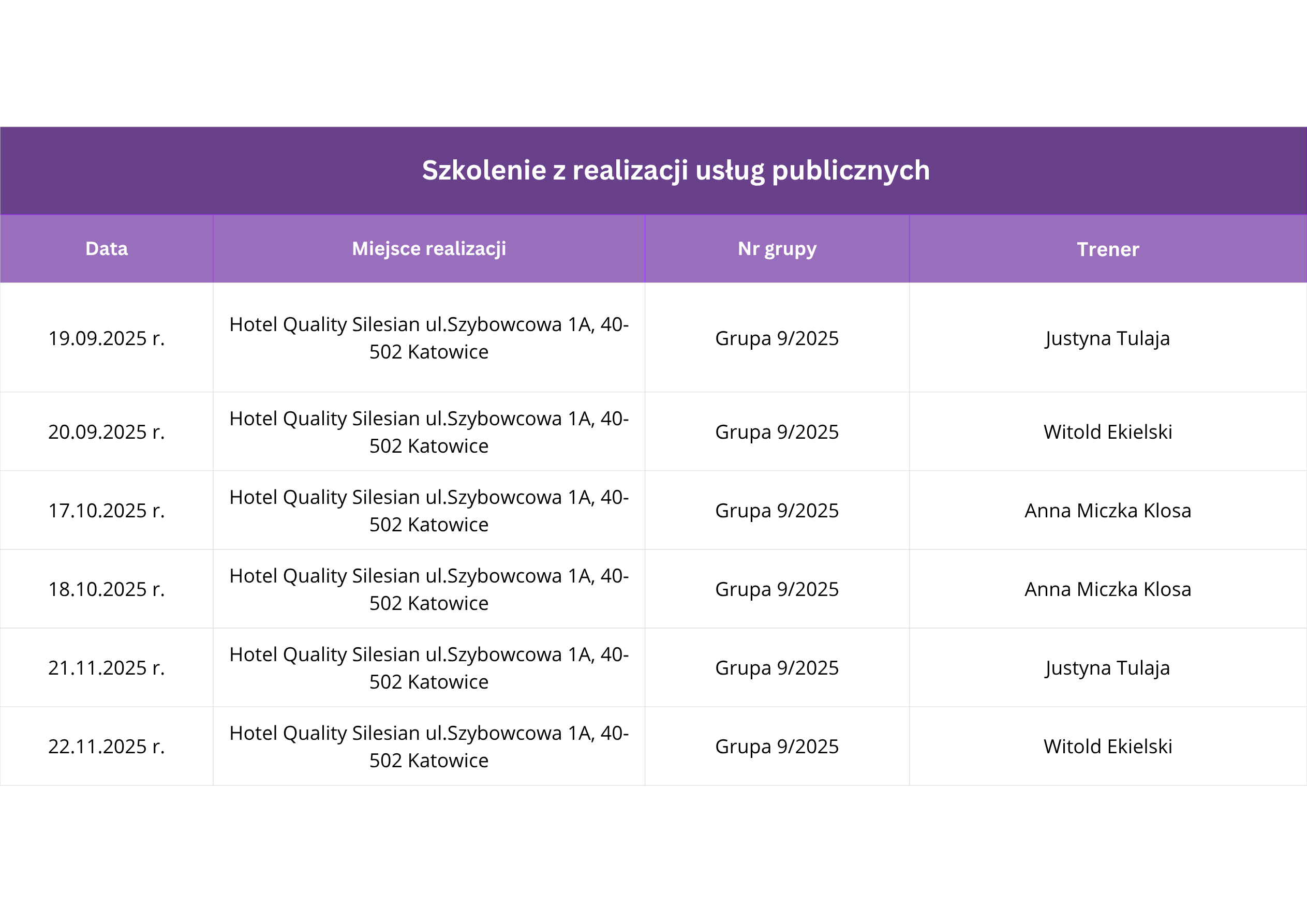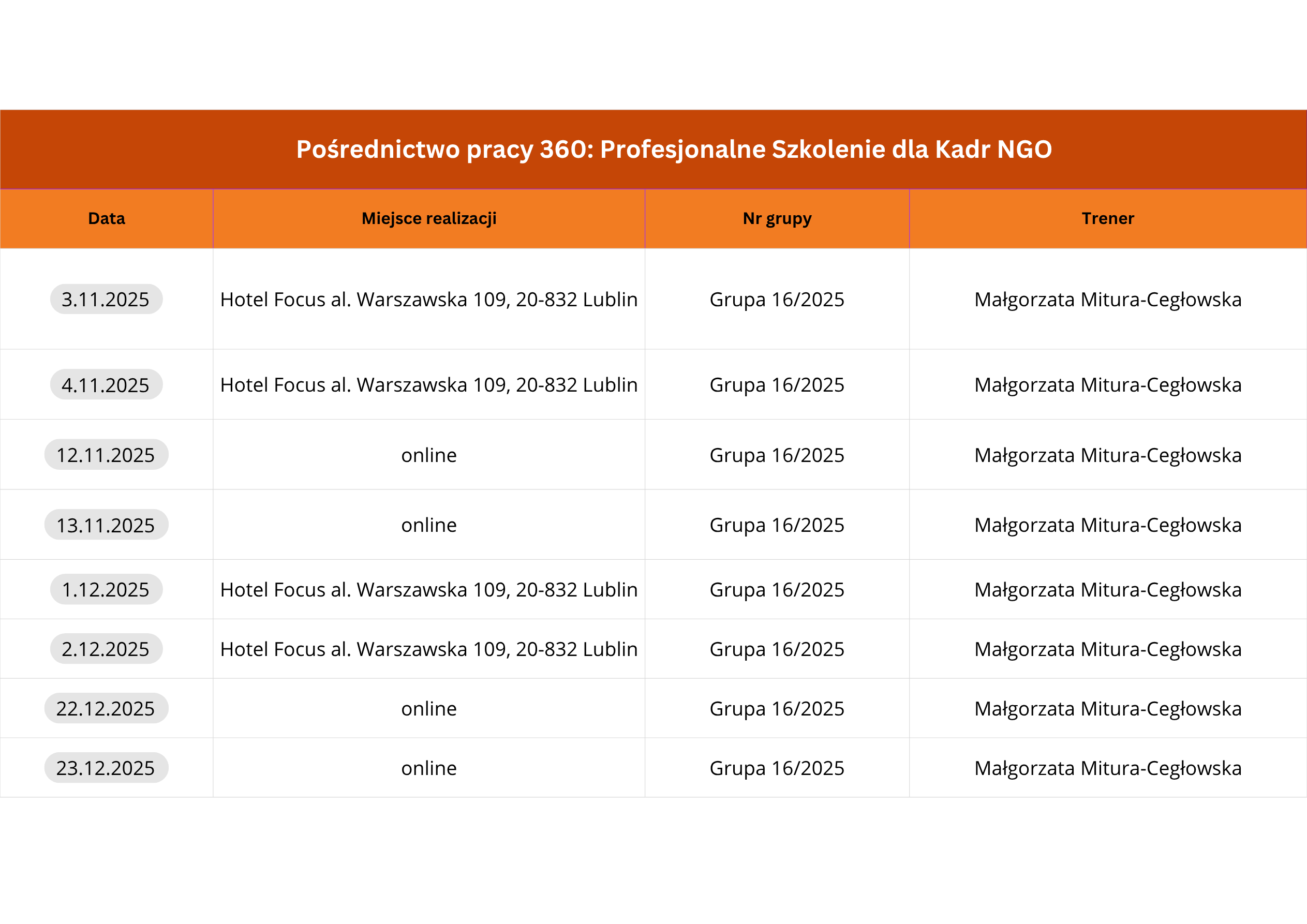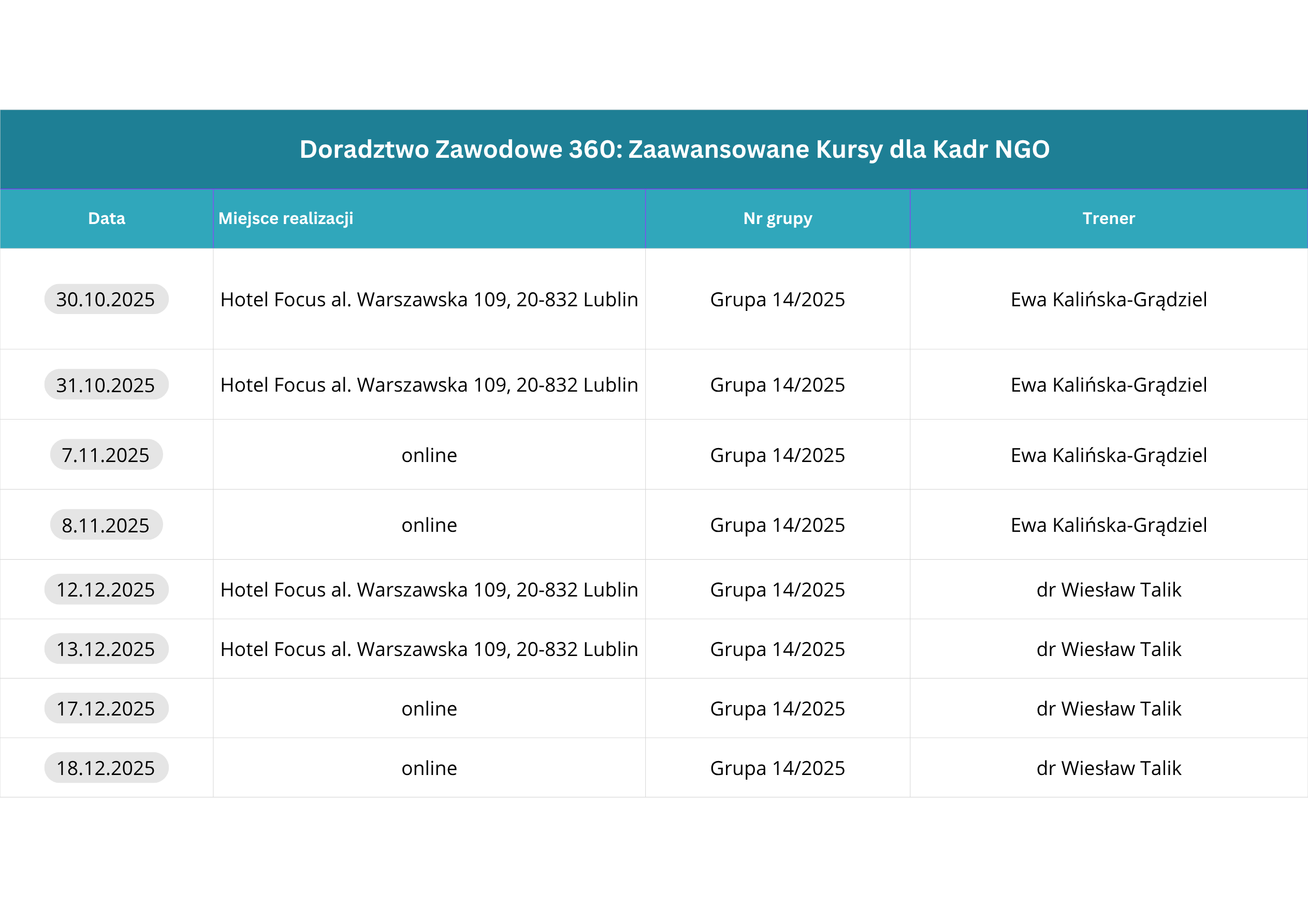 Planuje się organizację szkoleń w dużych miastach, umożliwiający swobodny dojazd. Wszystkie szkolenia obejmują 64 godziny i zostaną zorganizowane hybrydowo – 2 zjazdy w formule stacjonarnej, 2 zjazdy w formule online.