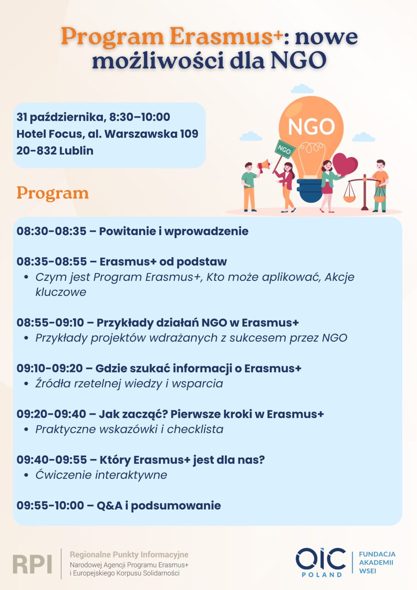 Celem warsztatu jest pokazanie organizacjom pozarządowym możliwości rozwoju, jakie daje Program Erasmus+, oraz praktyczne wsparcie w przygotowaniu się do aplikowania.